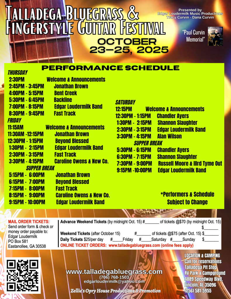 We invite you to become part of our Talladega Bluegrass & Fingerstyle Guitar Festival family!